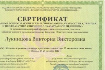 Доктор акушер-гинеколог Лукинцова В. В. приняла участие в IV Междисциплинарном форуме с международным участием «Шейка матки и вульвовагинальные болезни. Эстетическая гинекология»