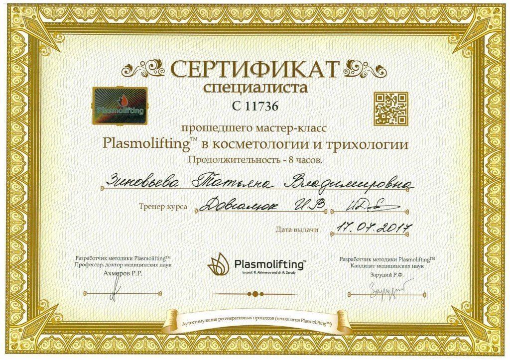 Врач-дерматолог/косметолог Зиновьева Т. В. приняла участие в мастер-классах по косметологии